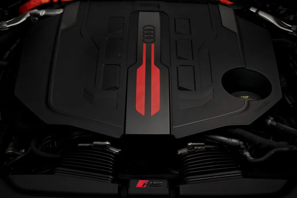 RS5 переходит на гибридную архитектуру с сохранением привычной V6. Под капотом — эволюция двигателя EA839: 2,9-литровый twin-turbo V6, дополненный электромотором. Совокупная отдача оценивается примерно в 600 л.с. и ~800 Н·м крутящего момента — прирост около 150 л.с. и 200 Н·м относительно уходящего поколения.